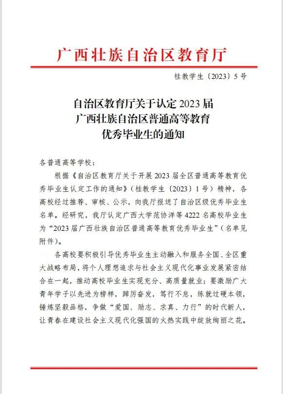 根据《自治区教育厅关于开展 2023 届全区普通高等教育优秀毕业生认定工作的通知》(桂教学生〔2023〕1 号)精神,认定4222名高校毕业生为“2023 届广西壮族自治区普通高等教育优秀毕业生”。交院有71名优秀学子位列其中。“于道各努力,千里自同风”。希望全体学弟、学妹们以他们为榜样,踔厉奋发、笃行不怠,为学校目标“争国家双高、创职业本科”贡献青春力量!“交院爱交院人,交院人爱交院”。交院见证了我们努力成长成才的...