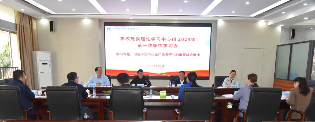 (党委宣传部 讯 张丽梅/文、图)1月3日,学校在园湖校区图书馆4楼会议室召开党委理论学习中心组2024年第一次集中学习会,专题学习习近平总书记在广西考察时的重要讲话精神。自治区教育厅语工处处长、语委办主任黄凯到会巡听旁听并做指导,会议由学校党委书记陈湘如主持。 陈湘如书记对习近平总书记在广西考察时的重要讲话精神进行导学,指出习近平总书记的重要讲话高屋建瓴、视野宏阔,思想深邃、内涵丰富,对广西加快构...