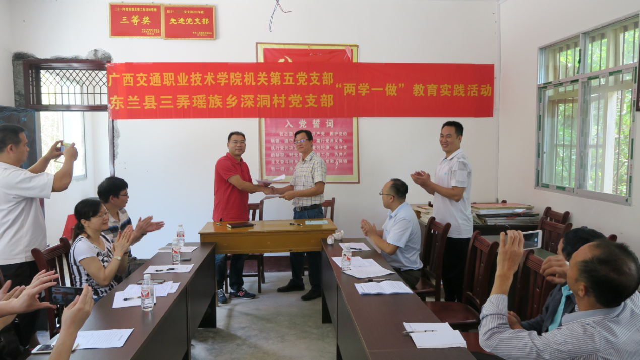 (机关第五党支部 讯 唐纯)近日,机关第五党支部前往东兰县三弄瑶族乡深洞村党支部开展“两学一做”教育实践暨结对共建活动,并在深洞村支部委员会办公室召开了座谈会。 会上,深洞村党支部负责人首先对我院对本...