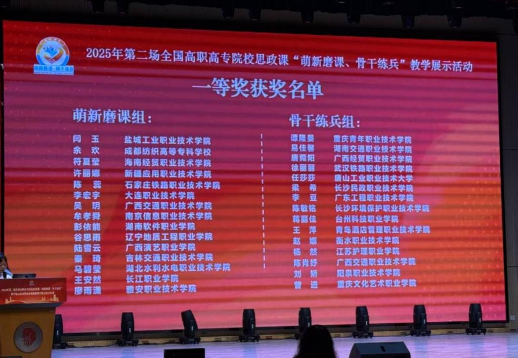(马克思主义学院 讯 邓锐、朱青穗/文、图)近日,学校马克思主义学院教师吴玥、陈肖妤在2025年第二场全国高职高专院校思想政治理论课“萌新磨课、骨干练兵”教学展示活动中,分别荣获“萌新磨课”组、“骨干练兵”组比赛一等奖。本次比赛由全国高职高专院校思政课建设联盟主办,重庆市高校思想政治理论课教指委“高职高专思政课”分教指委、重庆城市管理职业学院承办,经线上专家匿名评审和现场教学展示两个环节,在98个“萌新...
