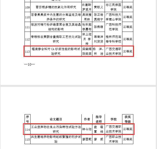 (路桥工程系 讯 李振成、李丽晶/文)近日,我院路桥工程系学子梁鹤耀、陈奕霖的《锰渣掺和料对CA砂浆性能的影响试验研究》项目和钟今阳的《工业废弃物改良土污染特性试验方法研究》项目喜获第十九届广西...