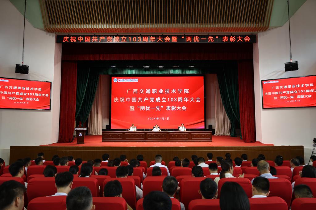 (党委办公室、党委宣传部 讯 郑枢 文/图)7月1日下午,学校在园湖校区大礼堂召开庆祝中国共产党成立103周年暨“两优一先”表彰大会。学校党委书记陈湘如在大会做主旨讲话,强调指出,要勇担使命、争先进位、走在前列,进一步凝聚“进国家双高、创职业本科”的信心和力量,共同开创以高质量党建引领学校事业高质量发展的新局面,凝心聚力当好奋力谱写中国式现代化广西篇章的开路先锋,贡献更大交院力量。大会现场奏唱国歌在家校...