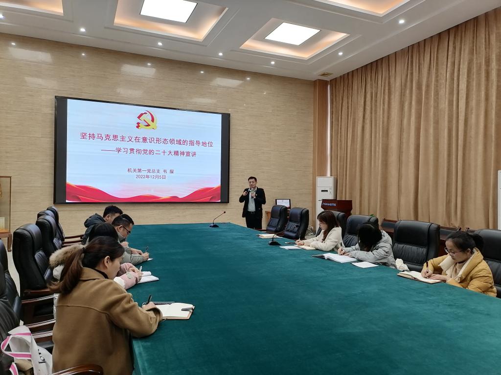 为学习贯彻党的二十大精神,12月5日,财审党支部邀请机关第一党总支书记韦耀在管理楼一楼会议室作党的二十大精神宣讲。会议由财审党支部书记杨茜主持,财审党支部全体党员参加。学校党委委员、党委办公室主任、党委宣传部部长、机关第一党总支书记韦耀作了题为“坚持马克思主义在意识形态领域的指导地位——学习贯彻党的二十大精神宣讲”专题报告。韦耀书记从“意识形态的内涵、为什么必须坚持以马克思主义为指导、坚持马克思主...