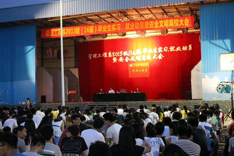 (管理工程系 讯 蒋波/文、唐倩倩/图)日前,管理工程系在四塘校区中二区灯光球场组织召开2016届(2013级)毕业生实习、就业动员暨安全文明离校教育大会。2013级全体学生到场参加...