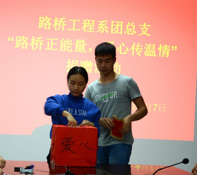 (路桥工程系 讯 杨洋/文 记者团/图) 近日,路桥工程系在副楼315会议室举办“路桥正能量,爱心传温情”的捐赠活动。各班级以自愿为原则共捐款6500余元送到面临困境的学生手中。 路...