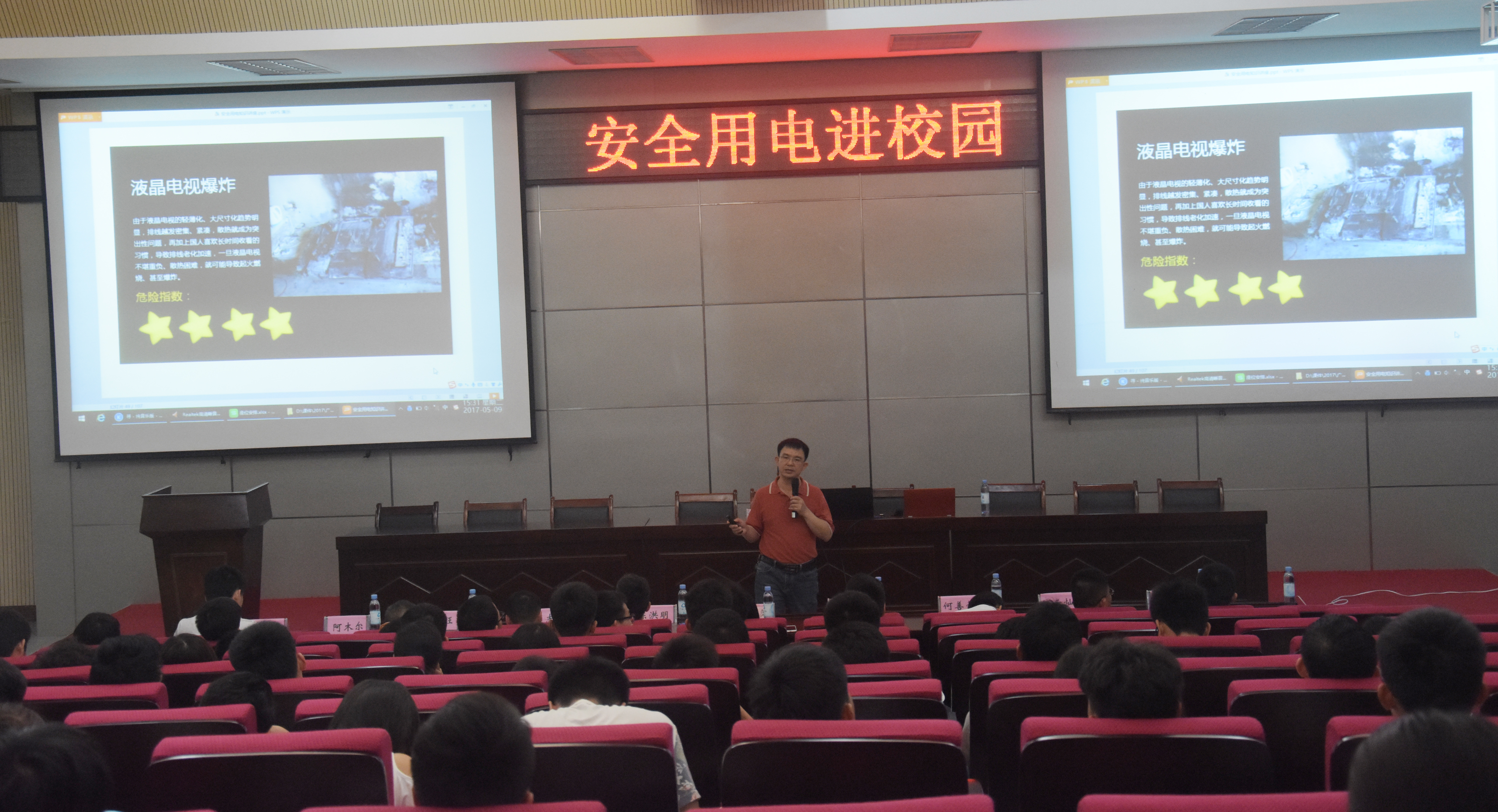 (后勤保卫处 讯 谢 凡、陈炳霖/文)近日,“安全用电知识进校园”专题讲座在C2多功能厅举办。全院200多名师生共同聆听了讲座。 讲座由邕宁供电公司办公室副主任马华斌教授主讲。他从电器火灾处理、触电类...