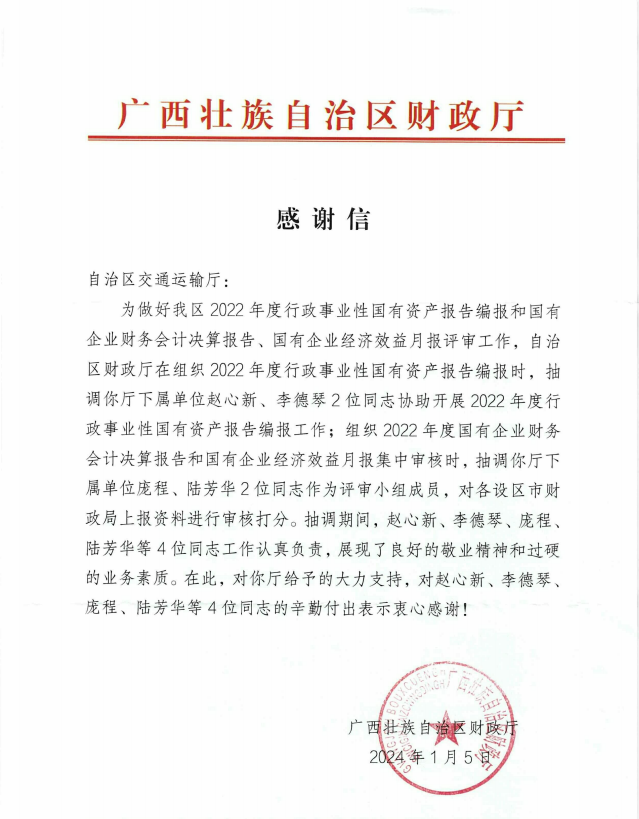 近日,自治区财政厅通报表扬自治区交通运输厅下属单位的4名同志,其中PP电子资产公司财务部陆芳华同志被抽调审核2022年度国有企业财务会计决算报告和国有企业经济效益月报,工作认真负责,展现了良好的敬业精神和过硬的业务素质,得到了财政厅的肯定和表扬,为PP电子校办企业树立了榜样。