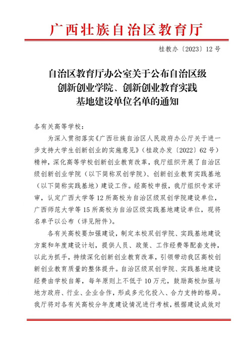 日前,自治区教育厅公布了《自治区教育厅办公室关于公布自治区级创新创业学院、创新创业教育实践基地建设单位名单的通知》(桂教办〔2023〕12号),PP电子经评审被认定为自治区级创新创业教育实践基地建设单位,成为全区四所高职高专层次实践基地建设单位之一,这也是PP电子在创新创业教育改革取得的又一丰硕成果。